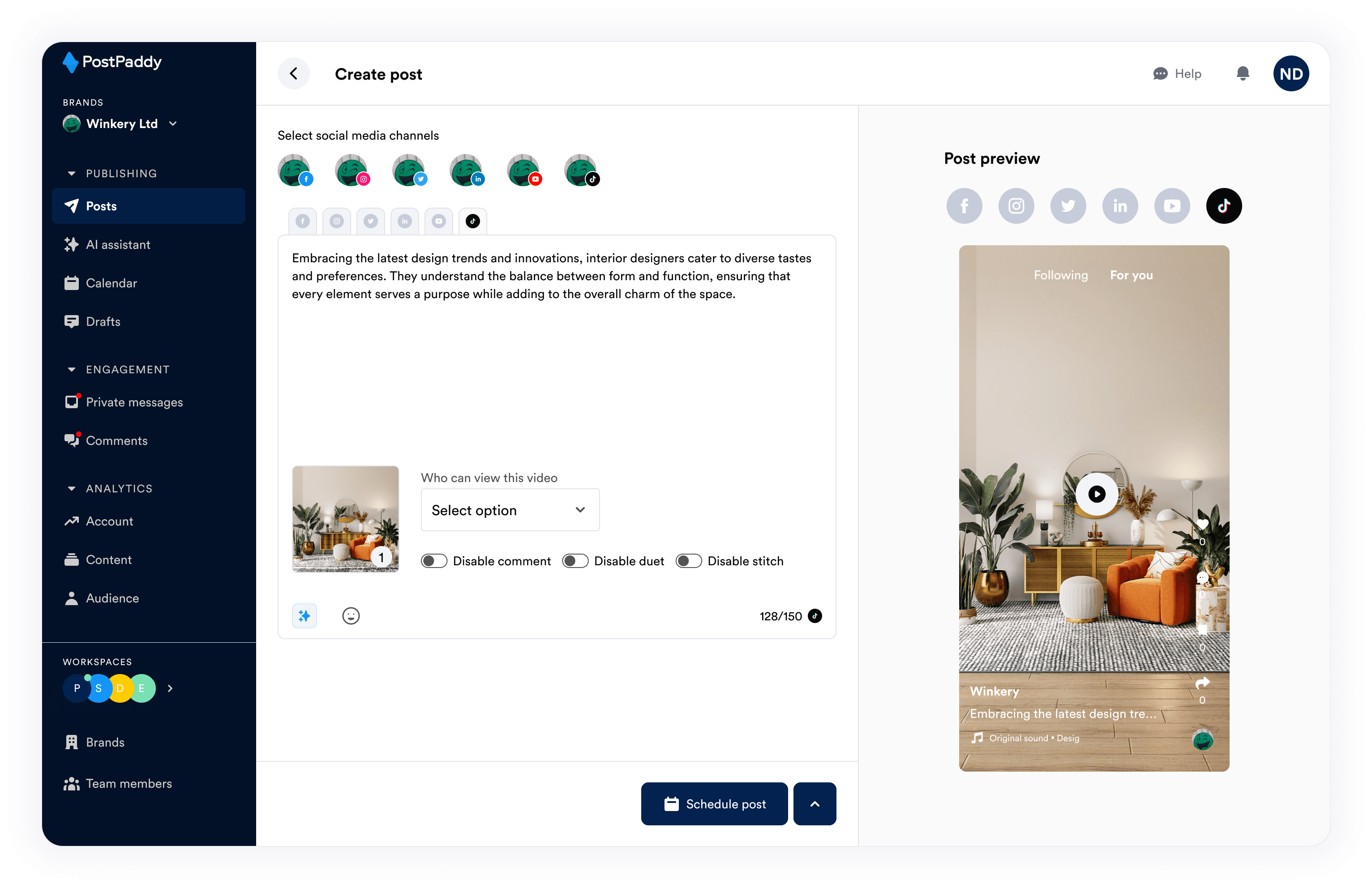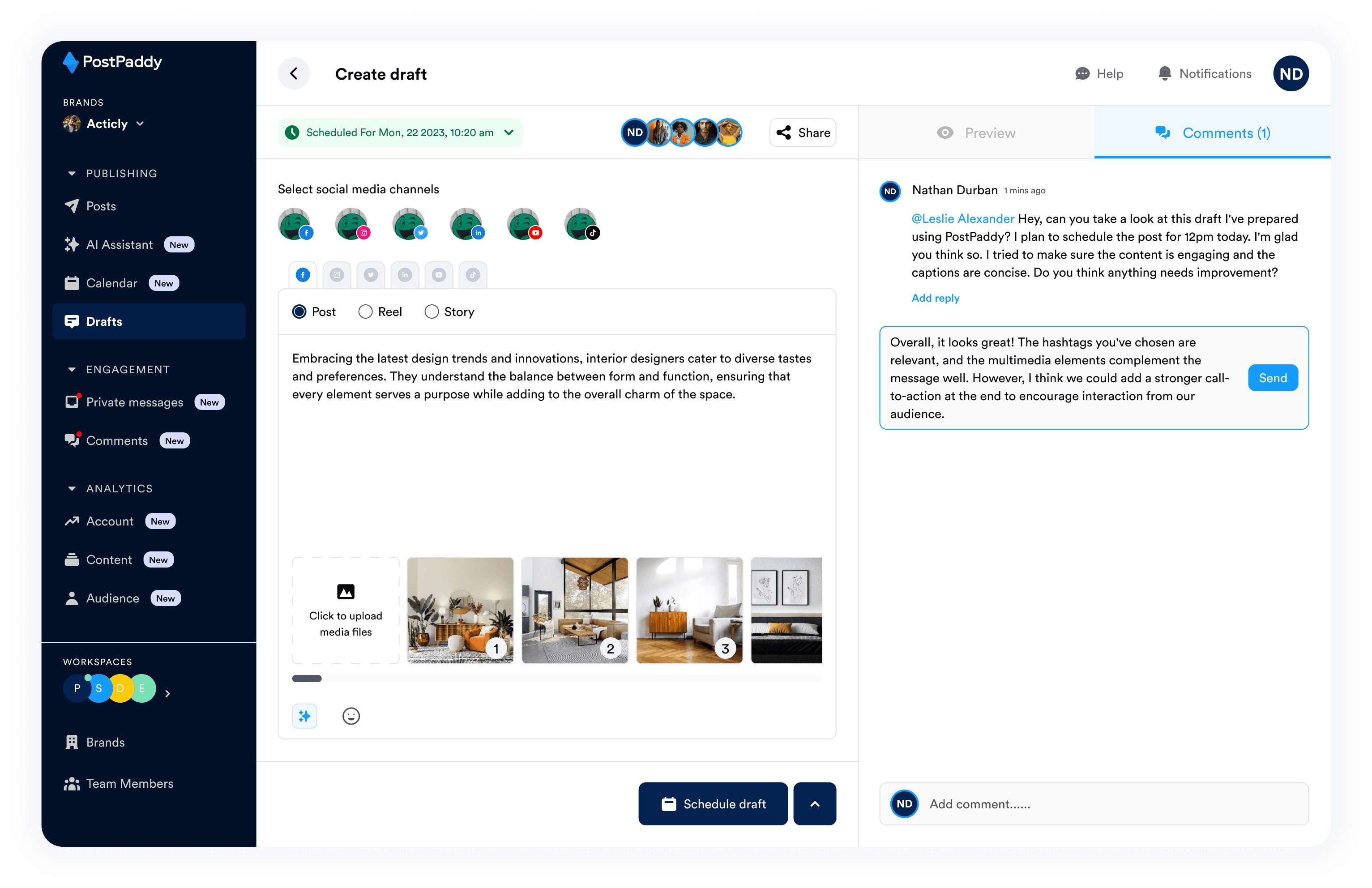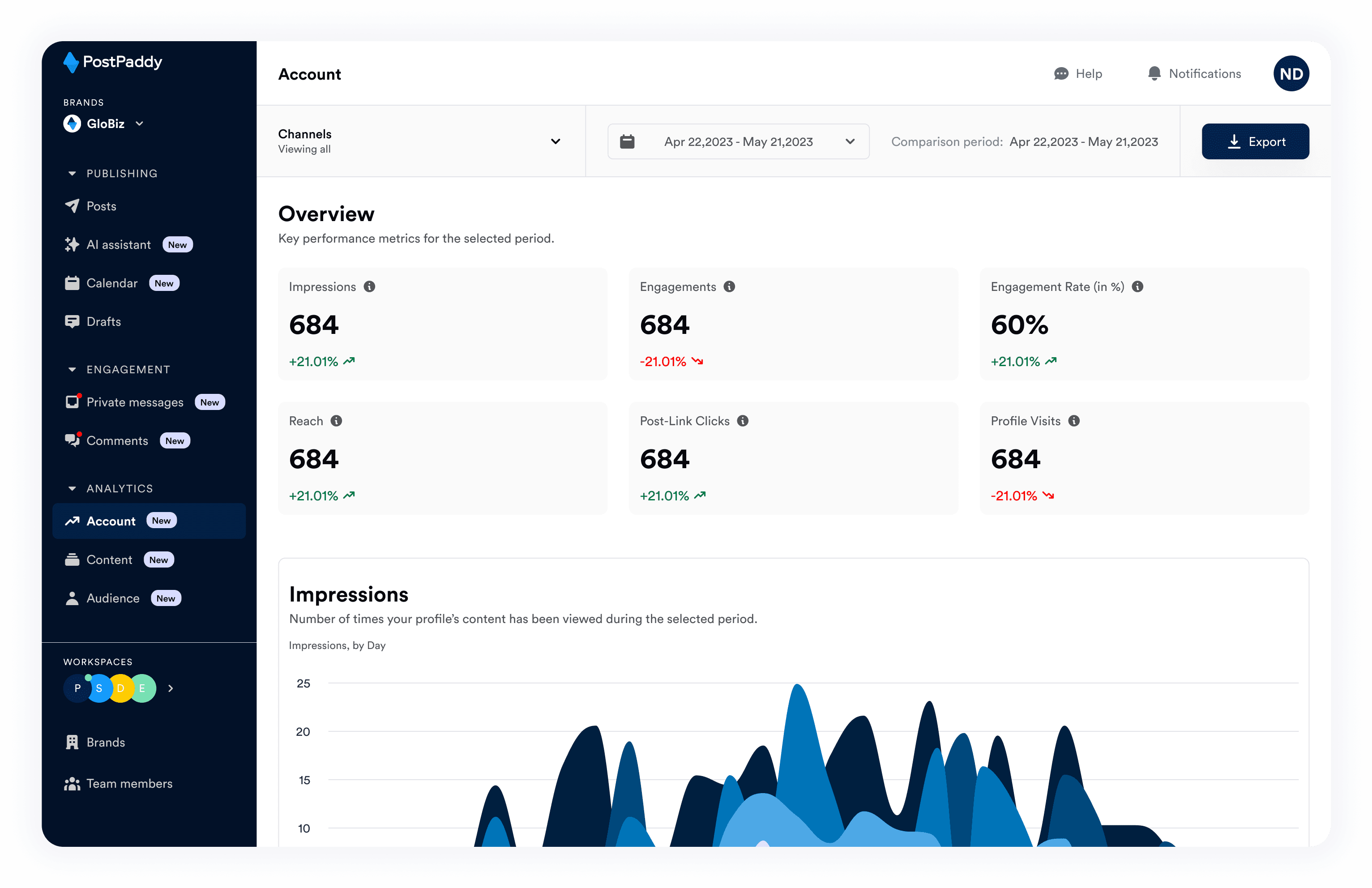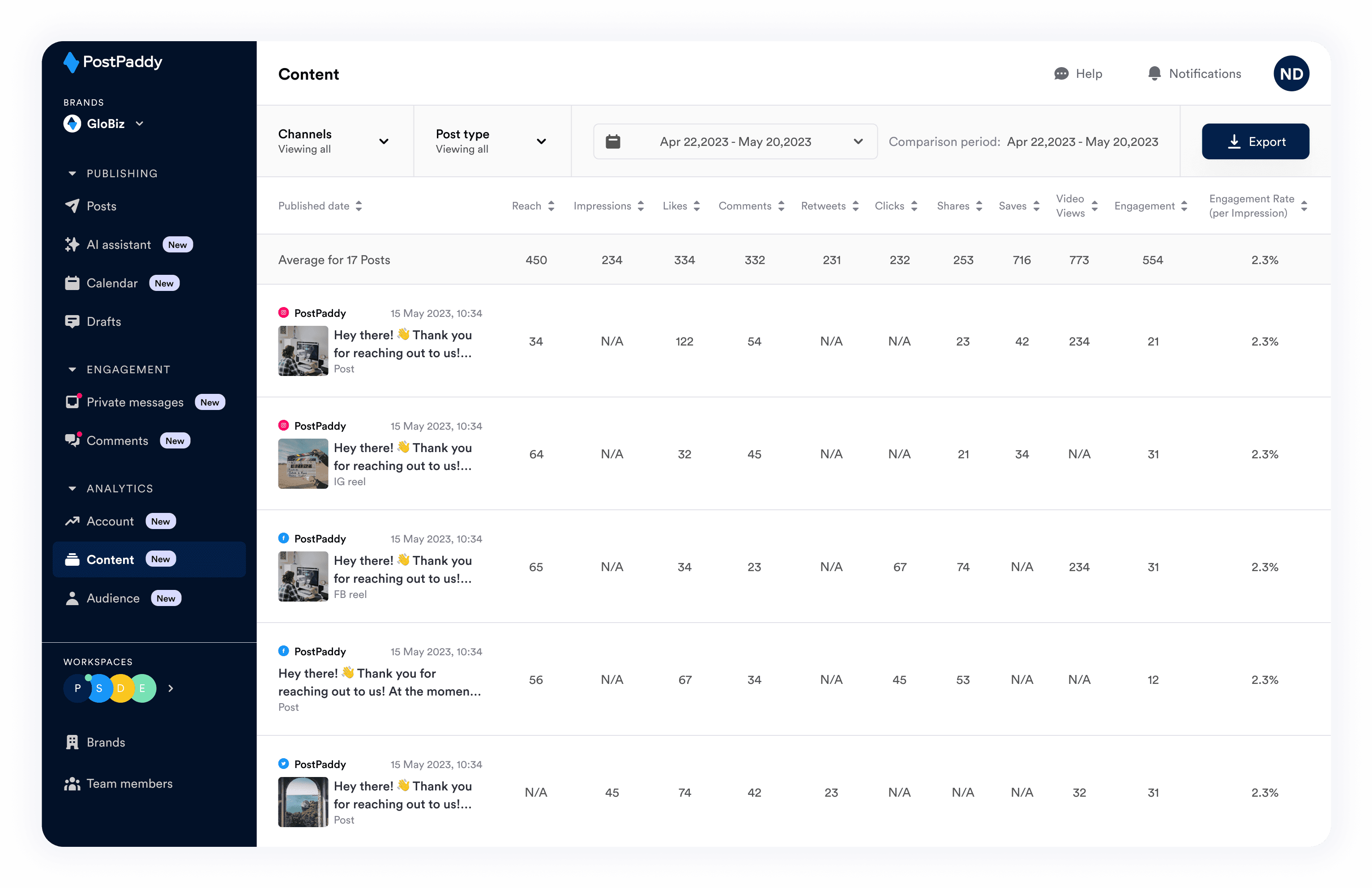 PostPaddy offers real-time social media analytics within the platform, including overall performance, individual post insights, and audience demographics.