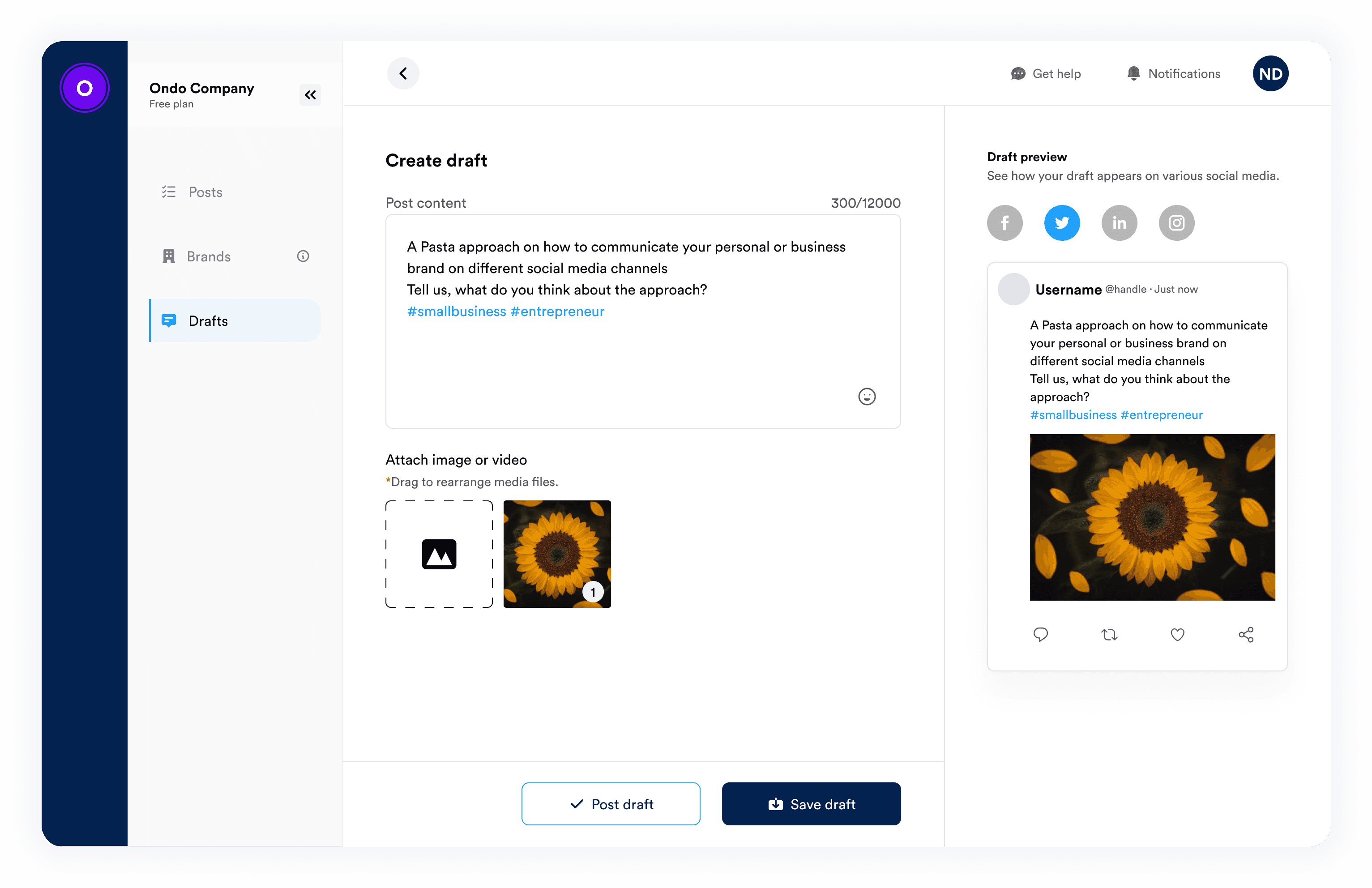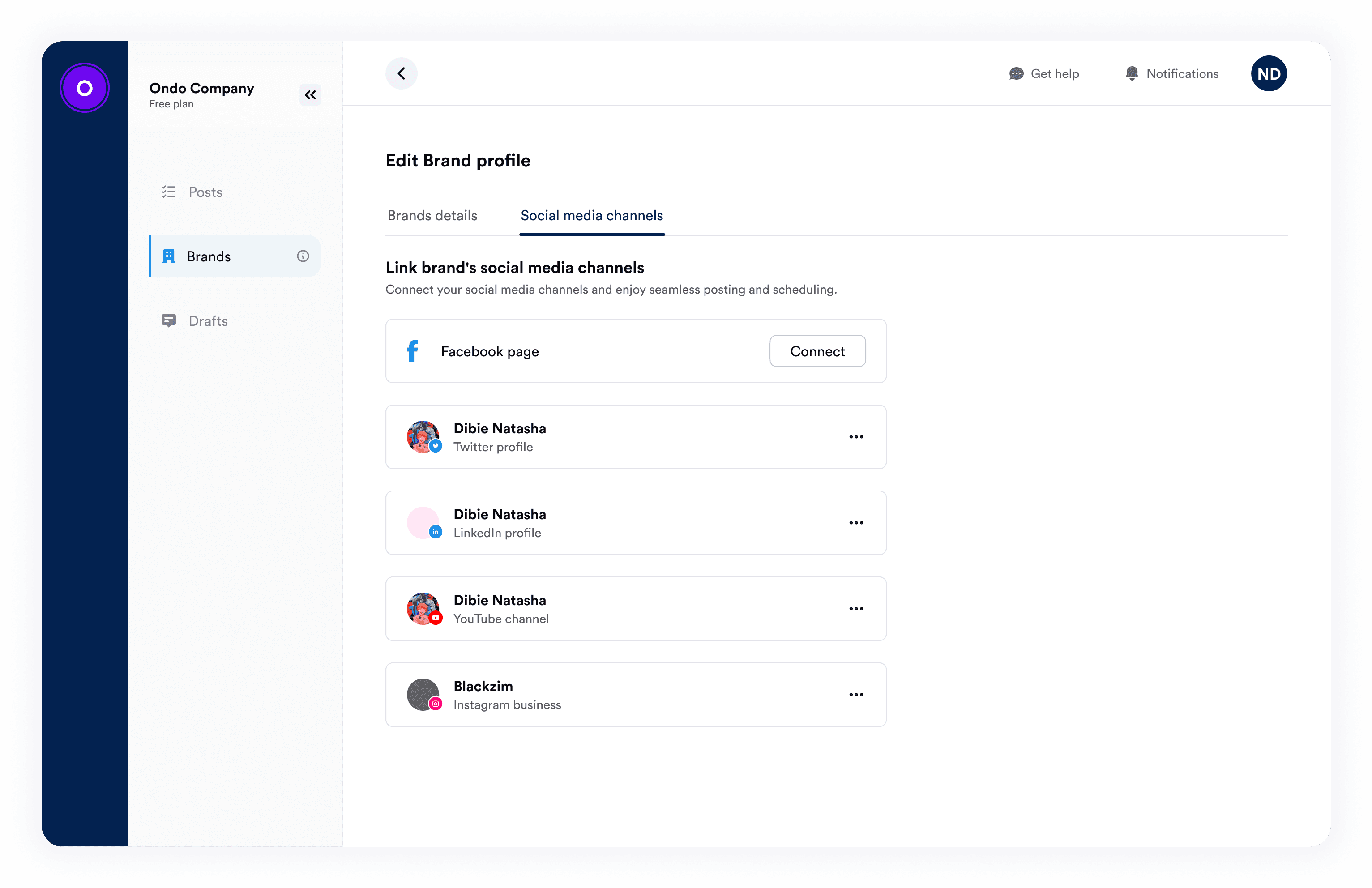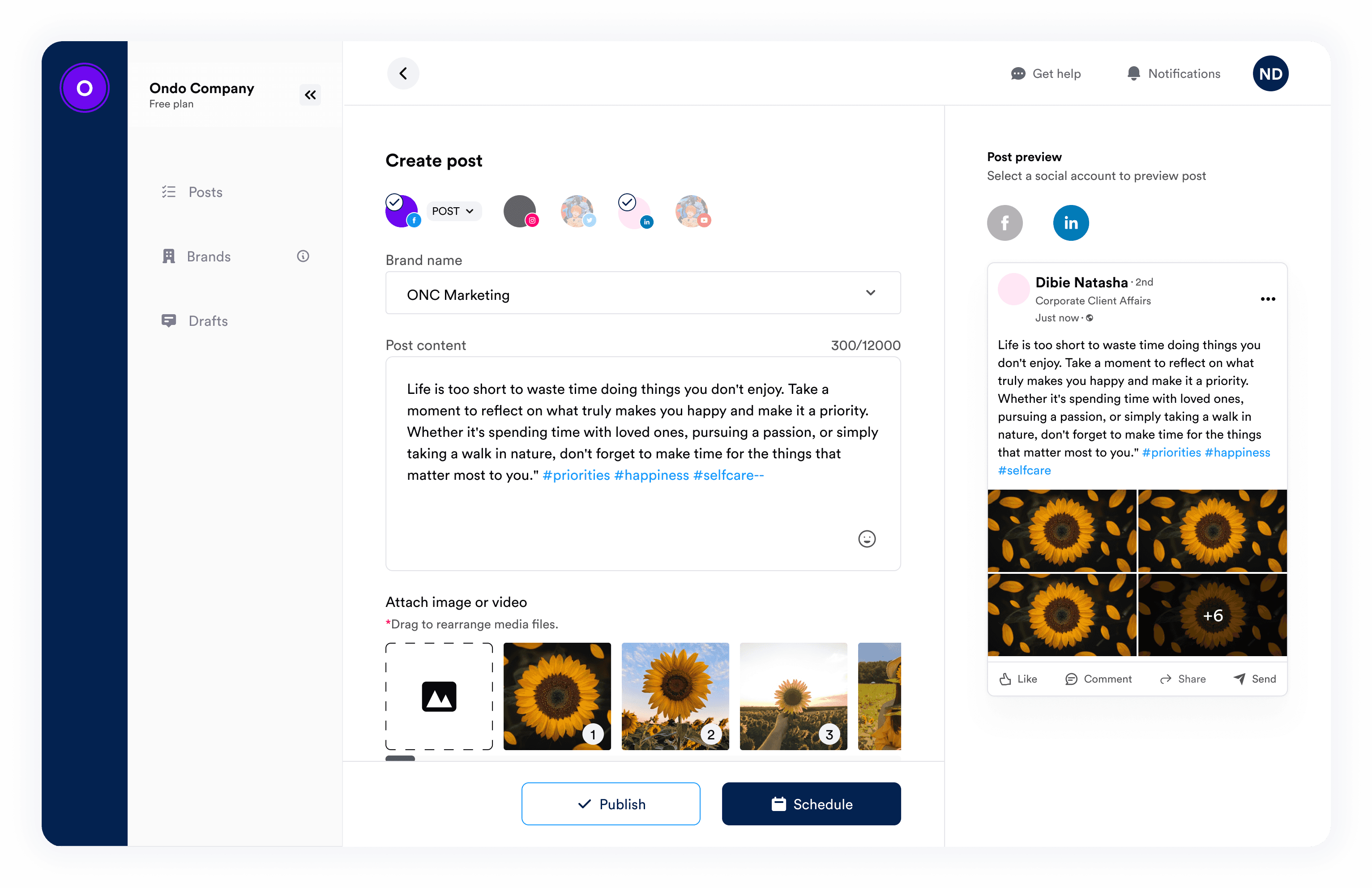 Social media management tool for scheduling and managing posts and brands respectively.