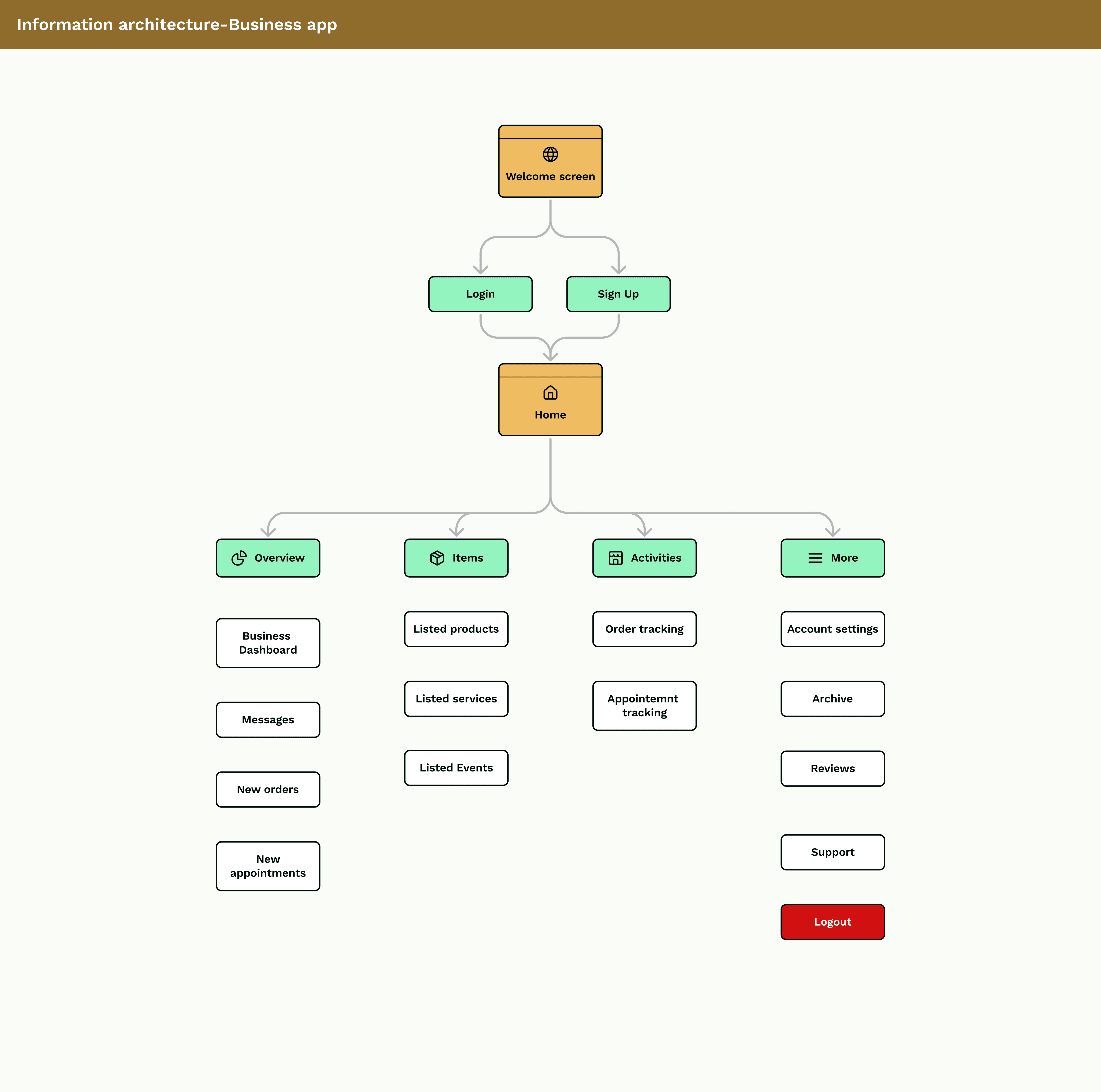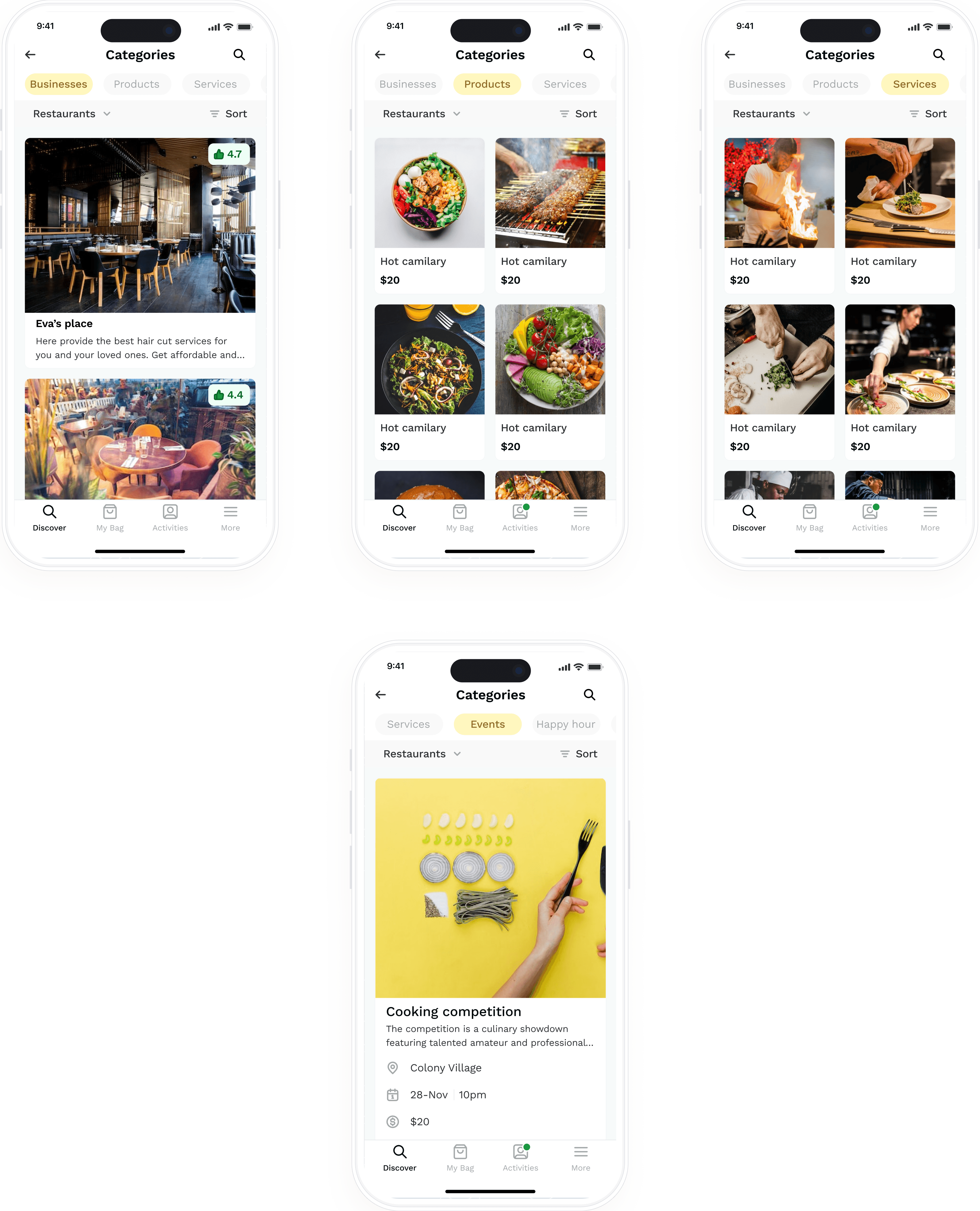 A business is an entity and the product, services, or events are children of the business. I employed a mental model approach of both physical and online items to solving this issue. While I understood that initial use might be a bit confusing for a new user, I hoped they would understand after navigating through the app.